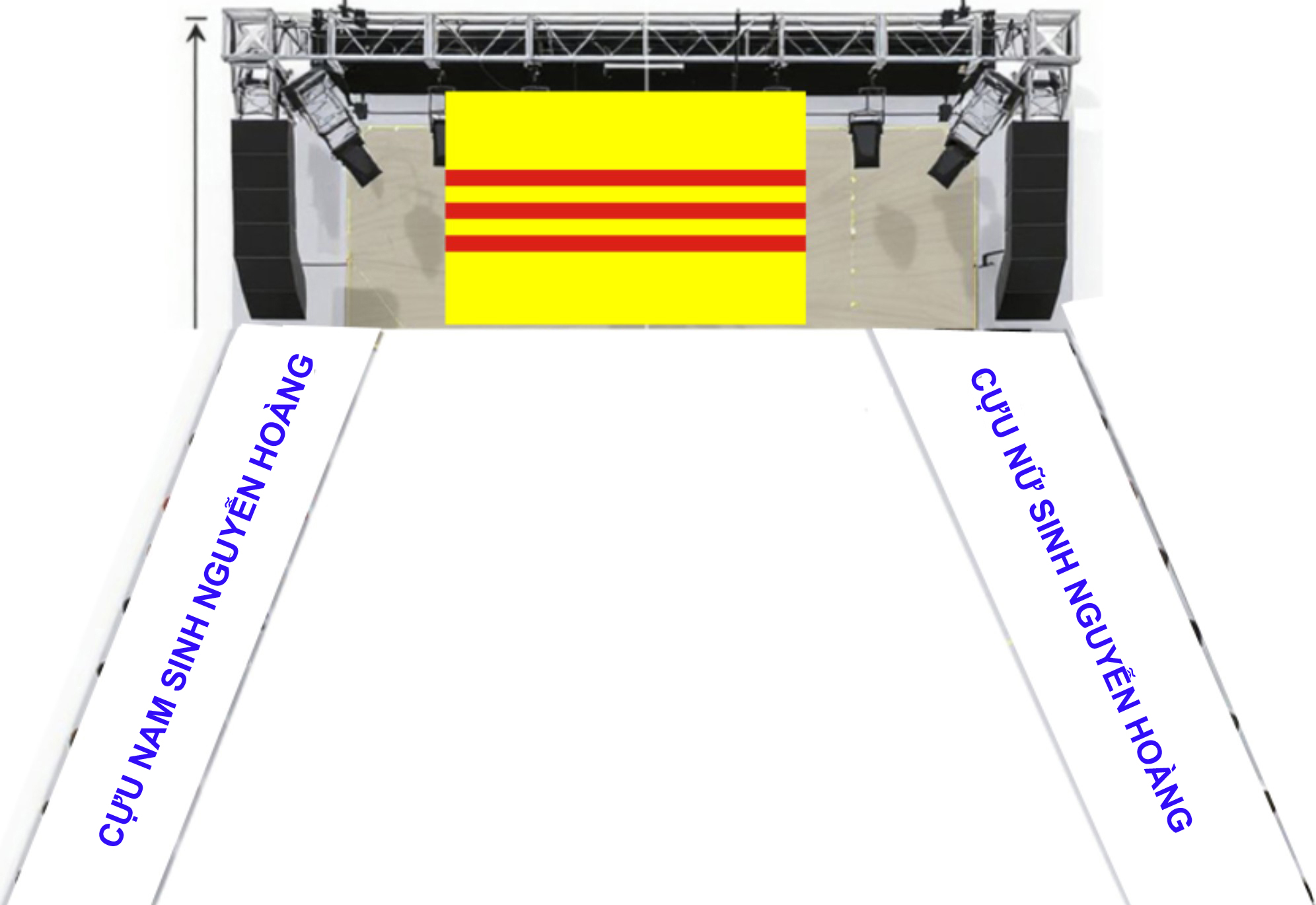 Cựu Nữ Sinh sẽ đứng bên phải của sân khấu. Cựu Nam Sinh sẽ đứng bên trái trước sân khấu theo đội hình sau đây: